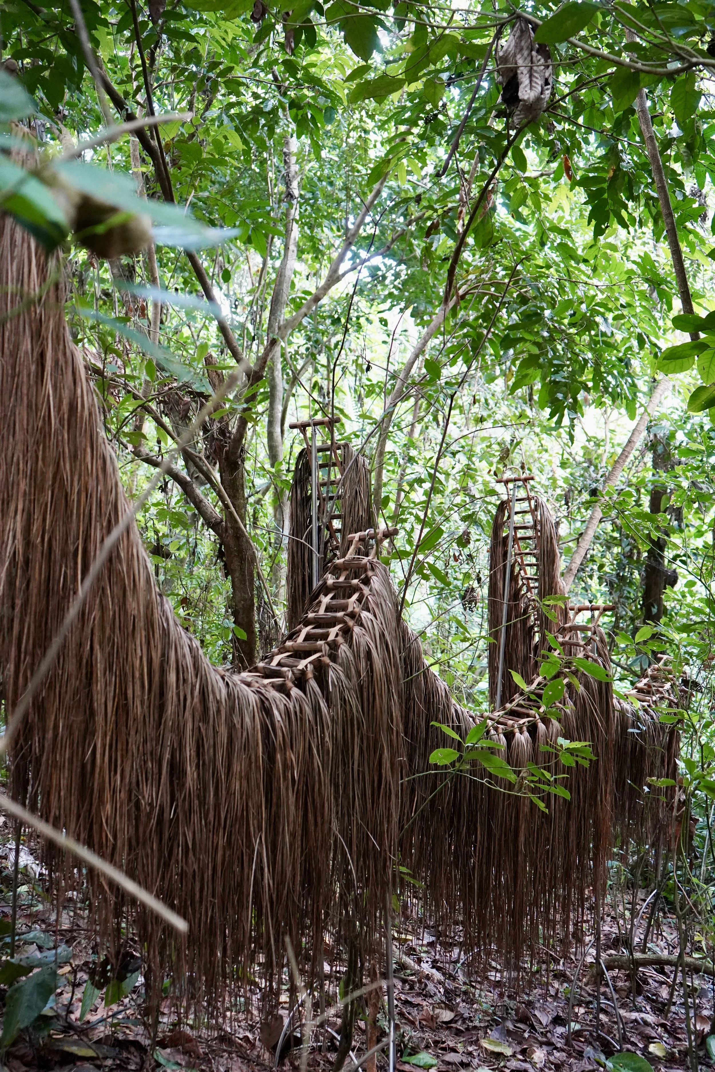 Durante el recorrido, tuvimos la suerte de encontrarnos con el artista Daniel Lind-Ramos finalizando su obra. Nacido en Loíza, Lind-Ramos es maestro del ensamblaje monumental y de la narración material, en los que teje narrativas complejas sobre memoria, resiliencia e identidad afrocaribeña. La Madre de Yocahú enlaza la mitología taína con la cuenca hidrográfica de El Yunque, considerada en la tradición como morada del dios.