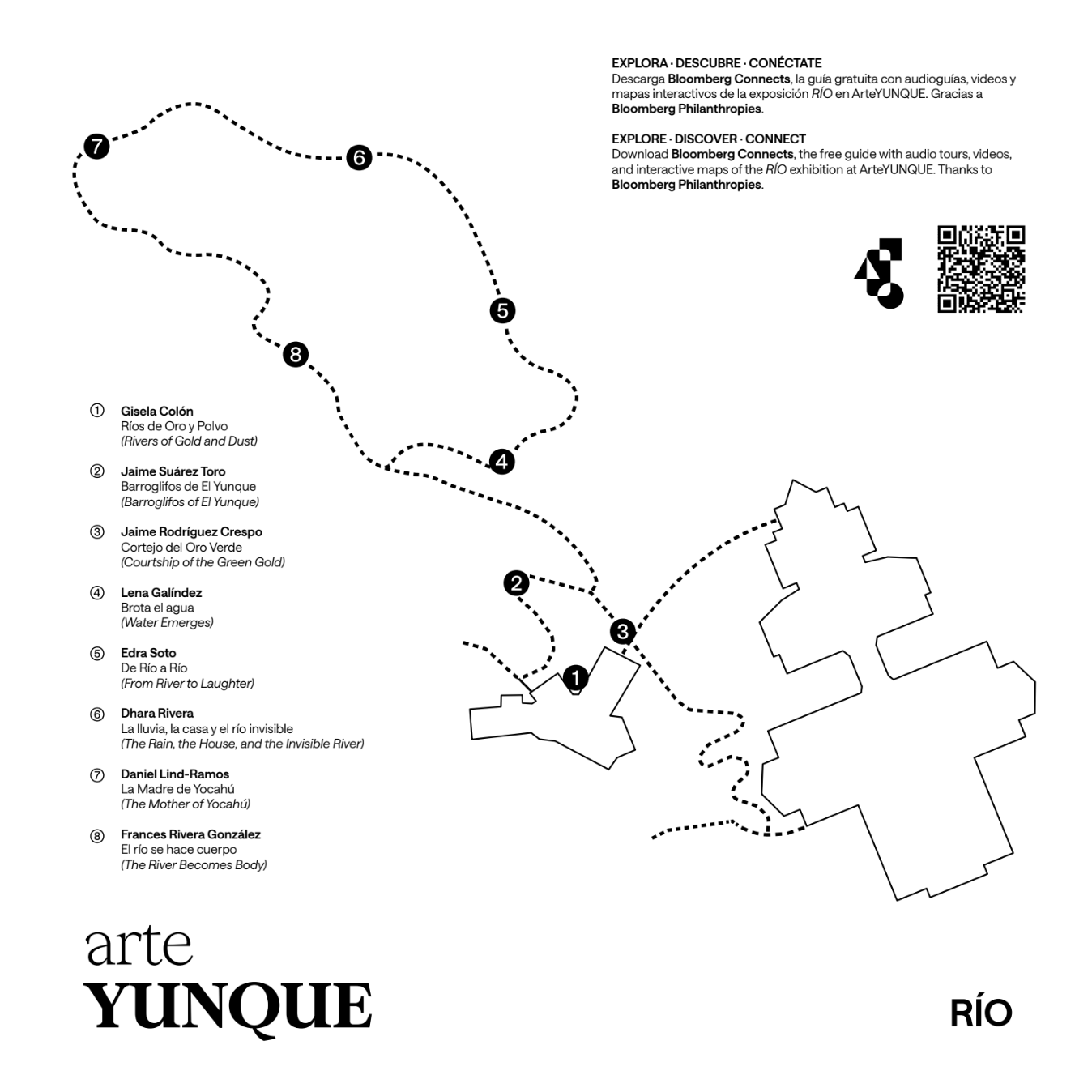 Llegué a El Yunque para ver RÍO: Cuenca hidrográfica de El Yunque, la nueva muestra de ArteYUNQUE. Ocho instalaciones creadas por los artistas puertorriqueños Daniel Lind-Ramos, Dhara Rivera, Edra Soto, Frances Rivera González, Gisela Colón, Jaime Rodríguez Crespo, Jaime Suárez Toro y Lena Galíndez trazan un mapa sensible del sistema fluvial del bosque, desde perspectivas culturales, ancestrales y ambientales. Las obras revelan algo esencial: que el río es fuerza transformadora, memoria antigua y puente entre territorio, biodiversidad y comunidad.
