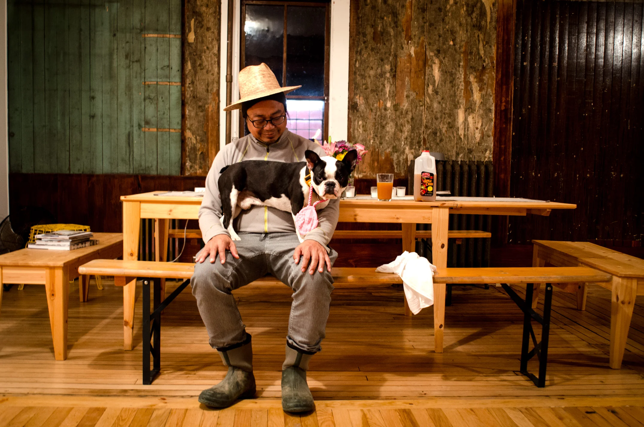 De alguna manera, y tal vez por inercia, terminamos en la sala, en la cocina de nuevo, en el comedor… ¡Y entonces la foto! Ahí estaba este legendario personaje… en un banquito, compartiendo un “claje arrebato” con nosotros y su mascota. Llegó el momento: props, sombrero, collar de jabón con la figura del papa, Mr. Harry -el perro de Rirkrit- y entre risas, tomamos la foto. Un instante de felicidad entre los que observamos... él y su perro.