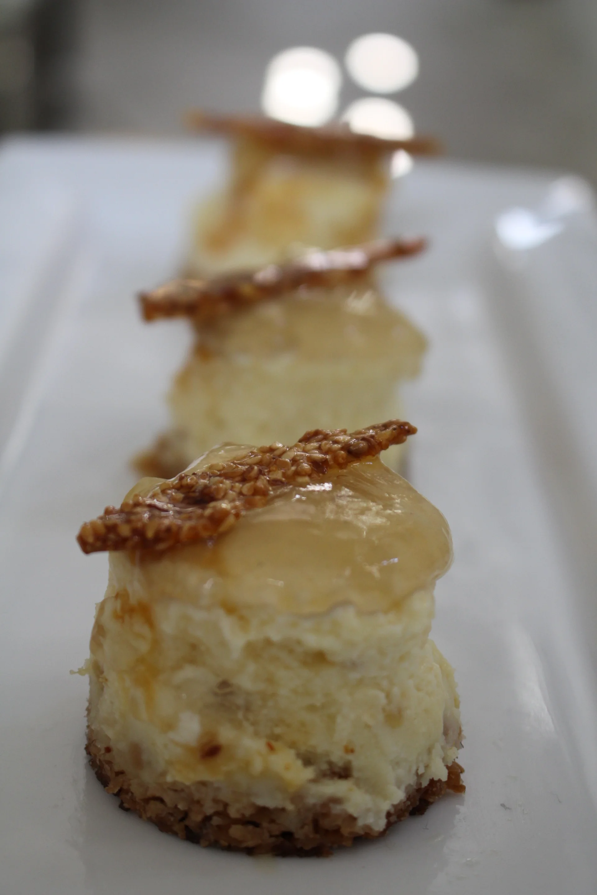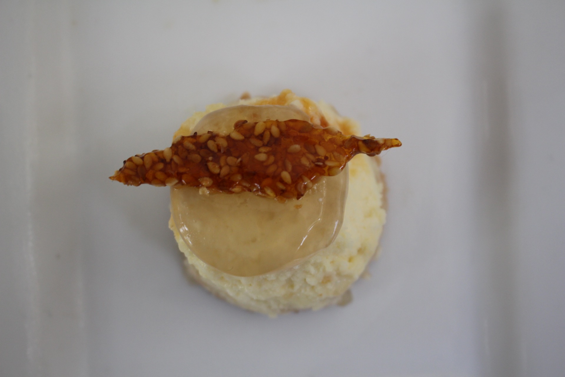 Cheesecake de Coco con crust, gelee y crocante de ajonjolí